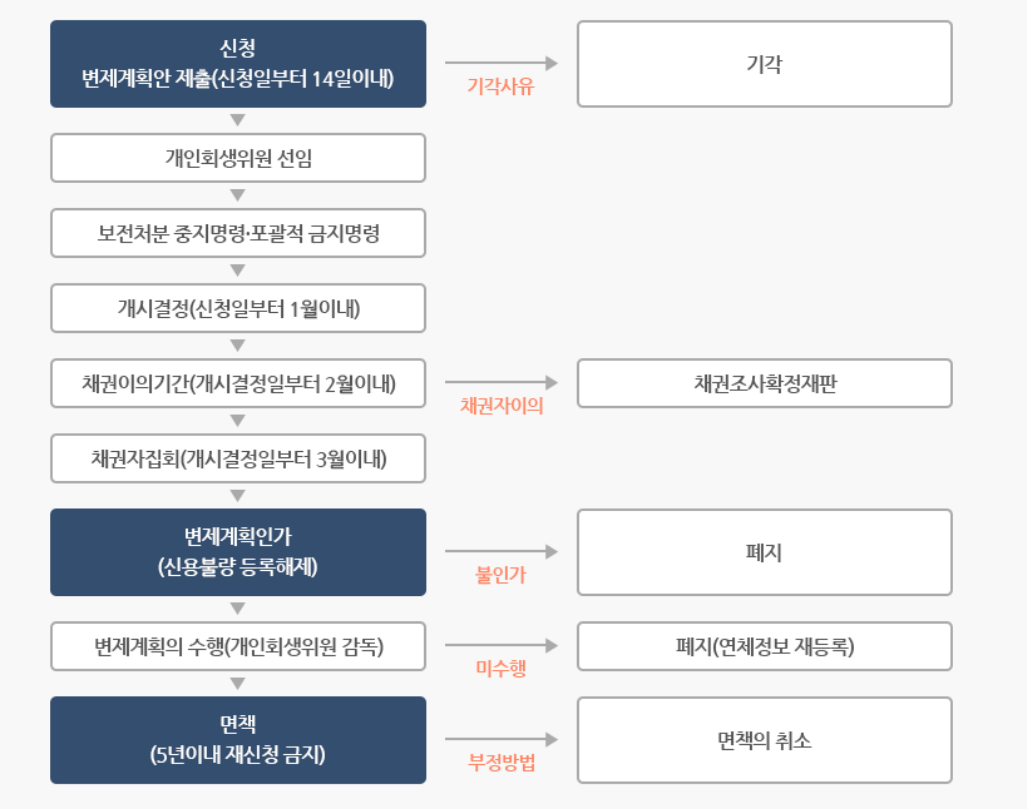 5. 인가결정 : 법원이 변제계획안을 인가하는 결정입니다. 이후 채무자는 스스로 변제계획안대로 변제를 이행해 나가게 됩니다.